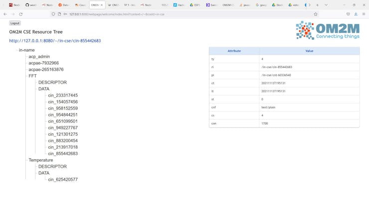 为了监控传感器,我们建立了一个 OM2M 平台,该平台拥有所需的所有资源。您可以通过在浏览器上刷新oneM2M平台界面(点击资源树的根元素“in-name”)来可视化平台上创建的资源。您应该能够在树结构中看到“温度”和“FFT”应用程序实体资源: