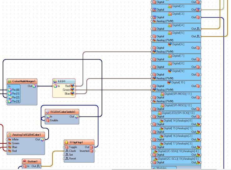 将Arduino数字输出引脚[3]连接到“Button1”引脚[In],这将用于打开/关闭LED上的自动颜色变化