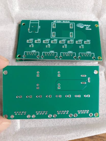 PCB 是双层的,在威廉希尔官方网站 板的相对两侧有宽电源轨道。组件数量非常少,只有 USB3 型母头连接器 (4)、单个 MP1584 降压转换器模块、用于 LED 指示灯的 4 个限流电阻器,以及用于开关和 LED 指示灯的公头引脚。最大的挑战是正确设置端口间距,以便轻松同时使用所有端口。一旦我开始使用 CAD/CAM 设计外壳,CNC 切割外壳也不应该太困难