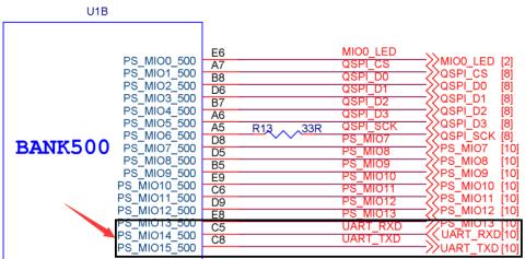 图 1.3.14是领航者核心板原理图的一部分。从图中我们可以看到,BANK500中的MIO14和MIO15被用作UART串口