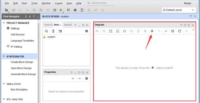 2-3 接下来在Diagram窗口中给设计添加 IP。点击上图中箭头所指示的加号“+”,会打开IP目录(IP Catalog)。也可以通过快捷键Ctrl + I,或者右键点击Diagram工作区中的空白位置,然后选择“ADD IP”。