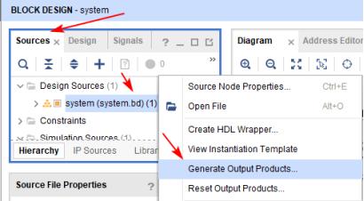 3-1 在Sources窗口中,选中Design Sources下的sysetm.bd, 这就是我们刚刚完成的Block Design设计。右键点击sysetm.bd,在弹出的菜单栏中选择“Generate Output Products”,如下图所示: