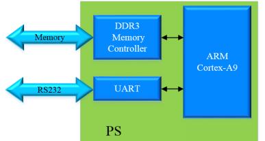 如图 1.1.2所示,以ARM Cortex-A9为核心、DDR3为内存,加上传输信息使用的UART串口就构成了ZYNQ嵌入式最小系统。可以看到,这个最小系统只包括了ZYNQ中的PS部分。