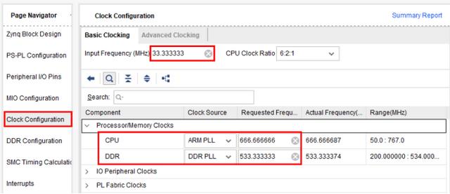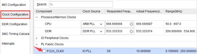 Clock Configuration页面用来配置PS输入时钟、外设时钟,以及DDR和CPU时钟等。