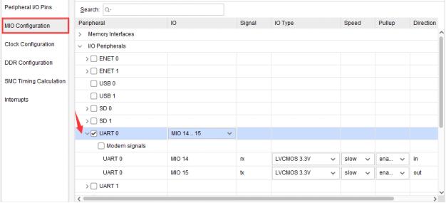 点击左侧的MIO Configuration页面,在右侧展开I/O Peripherals > UART0,可以看到更具体的引脚配置信息。其中MIO14作为RX引脚、MIO15作为TX引脚,如下图所示:
