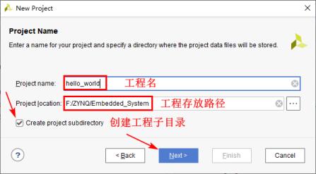 1-2 进入工程命名界面。设置工程名为“hello_world”,工程路径可使用任意路径,本章我们将该工程放在F:ZYNQEmbedded_System文件夹下。注意,工程名和路径只能由英文字母、数字和下划线组成,不能包含中文、空格以及特殊字符!