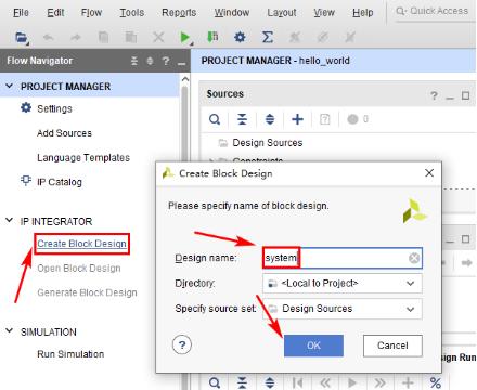 2-1 在左侧导航栏(Flow Navigator)中,单击IP Integrator下的Create Block Design。然后在弹出的对话框中指定所创建的Block Design的名称,在Design name栏中输入“system”。如下图所示: