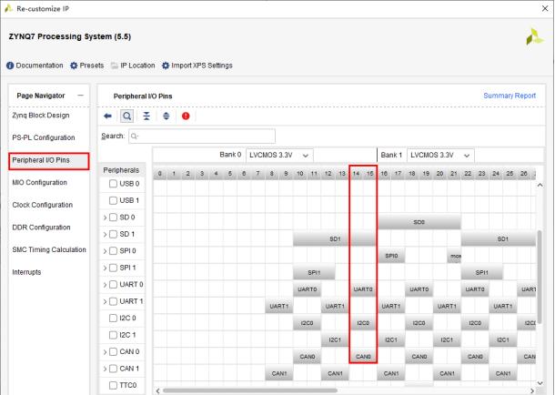 Peripheral IO Pins页面可以为不同的I/O外设选择MIO/EMIO配置。