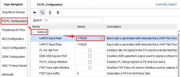 点击左侧的PS-PL Configuration页面,我们可以在这里设置UART0串口通信的波特率。在General目录下,可以看到UART0的波特率默认是115200。通过下拉按钮可以选择其他波特率,一般保持默认设置。