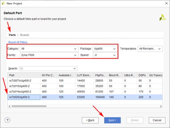 选择器件型号的方式有两种,一种是根据Parts,另一种是根据Boards,此处我们使用Parts选择器件。在Family栏里选择“Zynq-7000”, Speed栏选择“-2”,需要注意的是,在Package栏选择“clg400”。然后根据所使用的领航者核心板上的ZYNQ芯片型号,在下面的器件列表中选择“xc7z020clg400-2”,如下图所示。若是XC7Z010,相对应的器件为“xc7z010clg400-1”。