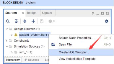 3-3 在“Hierarchy”标签页再次右键点击system.bd,然后选择“Create HDL Wrapper”。