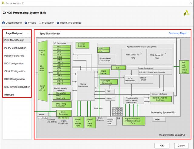 在Zynq Block Design页面,显示了Zynq处理系统(PS)的各种可配置块,其中灰色部分是固定的,绿色部分是可配置的,按工程实际需求配置。可以直接单击各种可配置块(以绿色突出显示)进入相应的配置页面进行配置,也可以选择左侧的页导航面板进行系统配置。