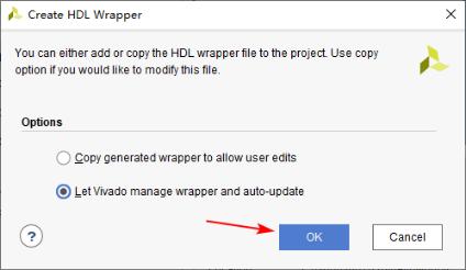 在弹出的对话框中确认勾选“Let Vivado manage wrapper and auto-update”,然后点击“OK”。