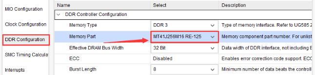 点击左侧的DDR Configuration页面,在右侧DDR Controller Configuration下的“Memory Part”一栏选择DDR的器件,XC7Z020的核心板选择MT41J256M16RE-125,XC7Z010的核心板选择MT41J128M16 HA-125。需要注意的是,我们在这里选择的型号并不是领航者核心板上的DDR3型号,而是参数接近的型号,或者说兼容的型号。其他的配置选项保持默认即可。