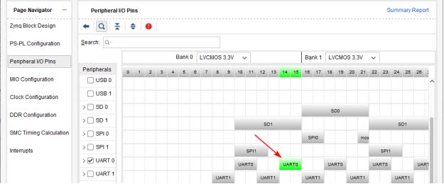 如下图所示,我们在MIO14和MIO15下点击UART0,方框的颜色会变成绿色,与此同时这两个MIO也会变成绿色。这就表明MIO14和MIO15被配置成了UART接口引脚,它们与PS中的串口