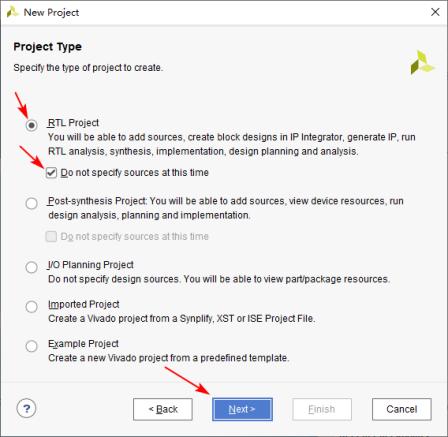 1-3 进入图 1.3.4所示的界面,在此界面设置工程类型。此处我们选择 “RTL Project”。本次实验不需要添加源文件和约束文件,所以勾选“Do not specify sources at this