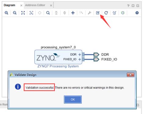2-12 本次实验不需要添加其它IP,直接按快捷键Ctrl+S保存当前设计。接下来点击下图箭头所指示的按钮,验证当前设计。验证完成后弹出对话框提示没有错误或者关键警告,点击“OK”,如下图所示: