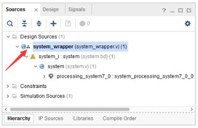 system_wrapper.v为创建的Verilog文件,箭头所指的“品”字形图标指示当前模块为顶层模块。该模块使用Verilog HDL对设计进行封装,主要完成了对block design的例化,大家也可以双击打开该文件查看其中的内容。