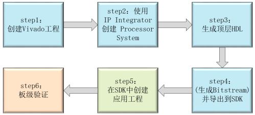 如上图所示,开发流程大体可以分为6步。其中step1至step4为硬件设计部分,在Vivado软件中实现;step5为软件设计部分,在SDK软件中实现;step6为功能的验证。复杂的程序还涉及Debug,这个也是在SDK软件中实施。具体每一步的操作我们会在后面详细介绍。