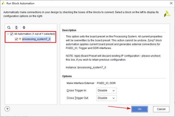 在该界面中我们可以选择自动连接IP模块的接口,包括导出外部端口,甚至可以自动添加模块互联过程中所需的IP。在我们本次设计中只有一个IP模块,在左侧确认勾选processing_system7_0,然后点击“OK”。