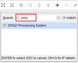 2-4 打开IP目录后,在搜索栏中键入“zynq”,找到并双击“ZYNQ7 Processing System”,将ZYNQ7处理系统IP添加到设计中。