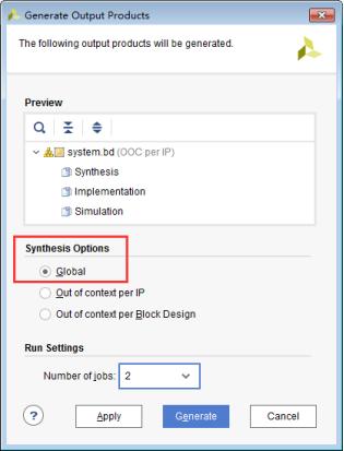 在对话框中Synthesis Options选择Global;Run Setings用于设置生成过程中要使用的处理器的线程数,进行多线程处理,保持默认或设置为个人电脑处理器最大可使用线程数都可以,一般选择最大可使用线程数的一般。然后点击“Generate”来生成设计的综合、实现和