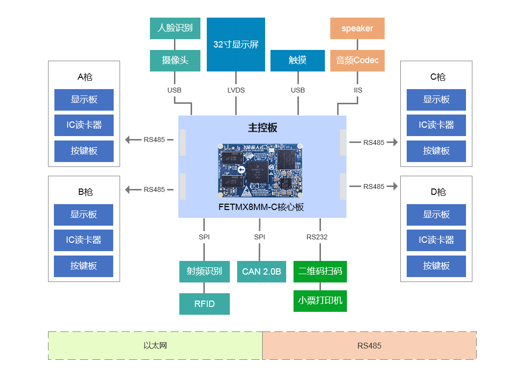 通信,i.MX8MM处理器最多可提供三路全双工增强同步SPI接口,一路用于射频芯片通讯,一路用于CAN接口扩展。最高支持52Mbit/s的数据速率,且均可配置为主从模式;