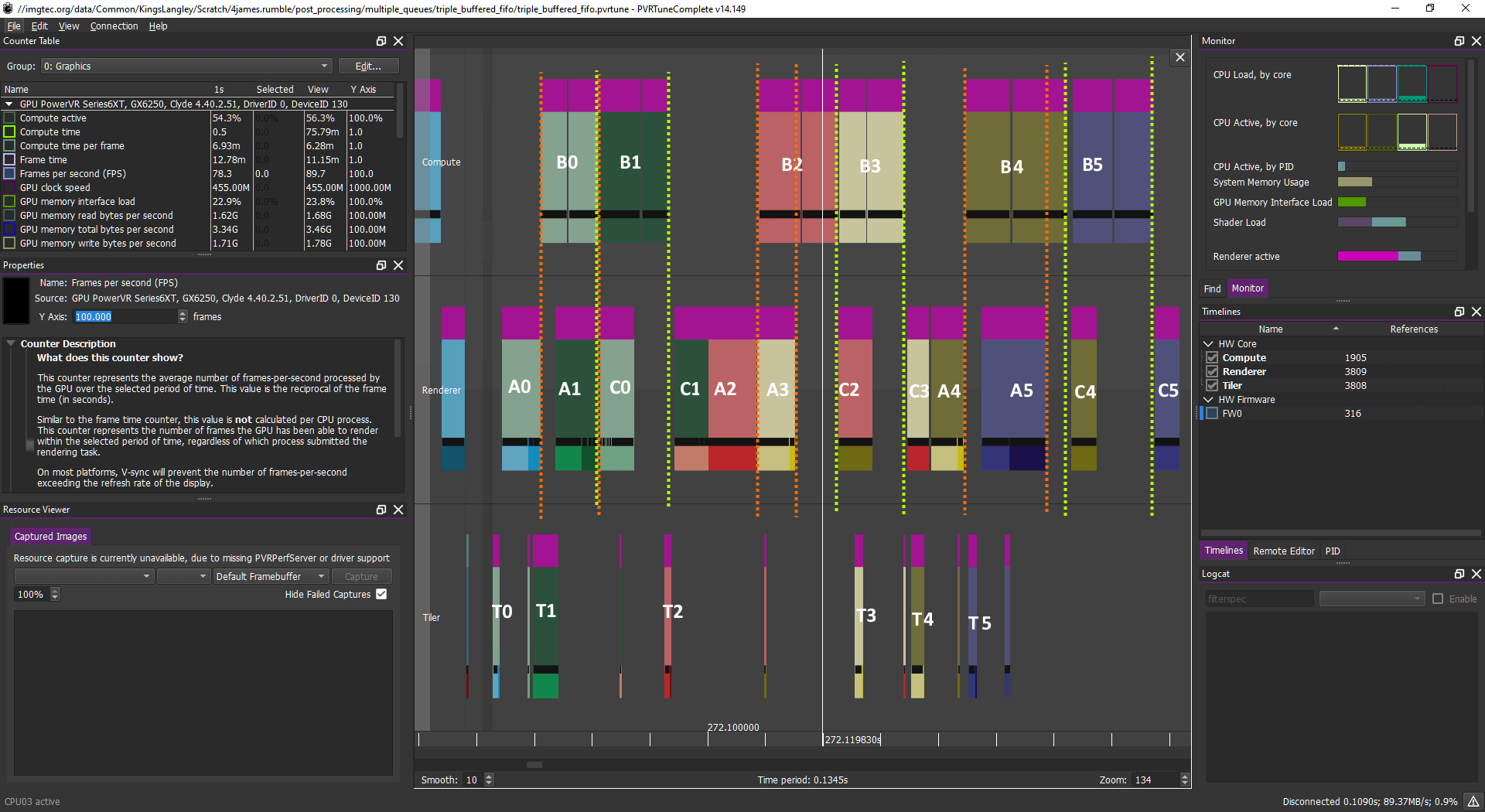 简而言之,由于每个连续帧都在不同的队列中提交,因此 GPU 可以自由地在帧之间并行调度任务,预期结果为 (CN+1) 在(AN) 完成之后开始执行。它可确保渲染器及其相应的调度程序始终繁忙,并且中间的计算不会串行化帧。