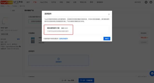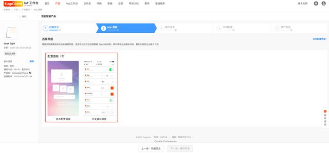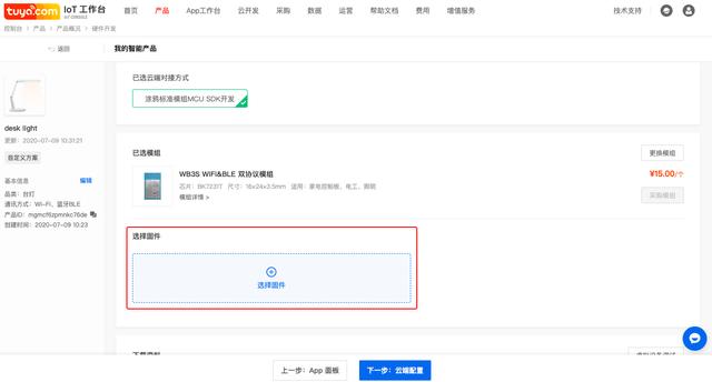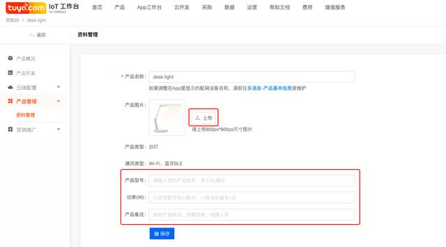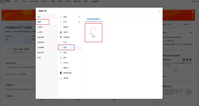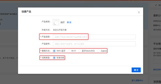 选择照明->台灯->台灯(自定义方案),输入产品名称(此名称显示于 App 控制界面),选择联网方式与功耗类型。 产品型号不会在 App 上显示,建议填写内部型号名称或客户产品型号,便于您在平台上进行产品维护以及订单管理。