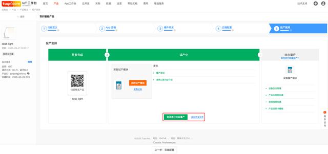 试产完成并测试通过后点击“测试通过开始量产”,配置参数将进入不可修改状态,避免误操作对使用该产品的消费者造成不必要的影响。