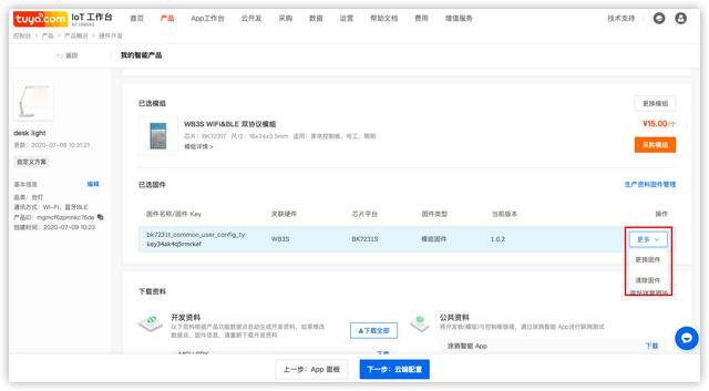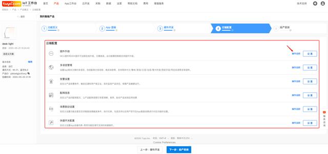 云端配置完成产品硬件配置之后,您还可以对产品的细节进行打磨。这里可对固件升级、多语言管理、告警设置、配网信息、场景联动设置、快捷开关配置进行进一步的管理,每个配置功能都附有操作说明供参考。