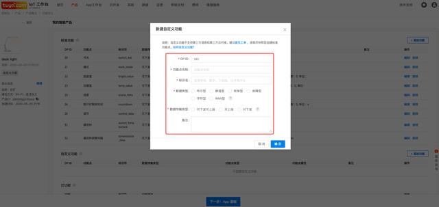 自定义功能:如果你的产品功能不在标准功能中,你可以自定义功能。 功能点是对产品功能的抽象表示,每种功能都可以通过不同功能类型定义。目前平台提供:布尔型、数值型、枚举型、故障型、字符串型、透传型这 6 种功能类型。 其中,布尔型、数值型、枚举型是基础类型,大部分功能都可通过这 3 种功能类型定义。故障型专门用于故障定义,便于故障在后台的统计。字符串型和透传型为高级类型,用于较复杂功能,只有当其他类型无法满足时,才推荐使用。