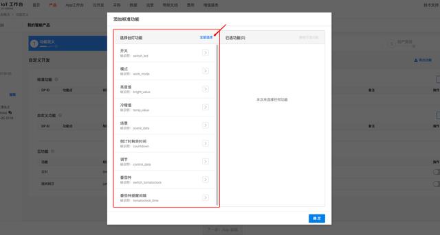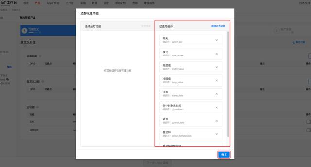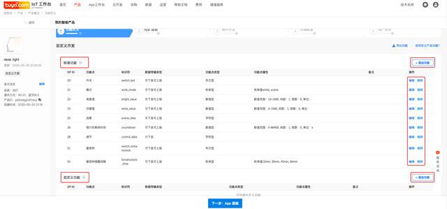 标准功能点你可以直接选择启用,启用后可根据产品实际功能进行编辑。无用的功能可删除,删除后仍可再次启用。 需要注意的是,标准功能由于已与部分 App 界面组件绑定,因此标准功能不支持更改标识符、功能类型及数据传输类别,其他属性可编辑。