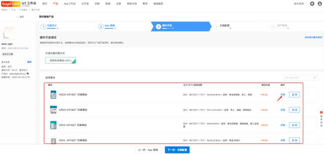 硬件开发根据产品的类型、形态、结构特点选择合适的模块,点击“详情”可以查阅模块规格书。