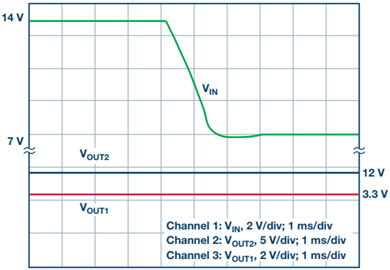 图 2. 显示了冷车发动过程。电源轨电压从 14 V 降至 7 V,但是 VOUT1 和 VOUT2 均处于稳压状态。