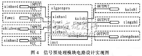 通过QuartusⅡ开发环境,文本编辑方式,用VHDL语言进行编程,生成图元,结合顶层原理图设计,实现信号预处理模块原理图,如图4所示。