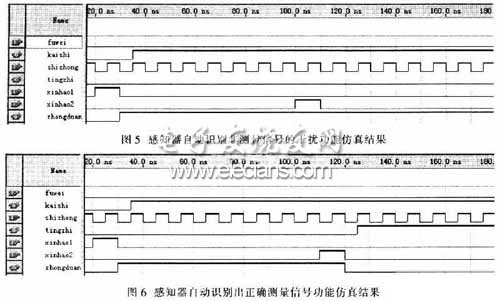 对编写的程序进行调试、编译通过,然后进行功能时序仿真,实现如果信号2到来之前已经收到信号l,并且已经在计数,但若小于预设的闸门关闭时间80 ns,则不进行闸门关闭。即中断保持高电平不变,停止信号保持低电平,感知器认为此信号为非测量信号2,继续监测信号2的到来,如图5所示。