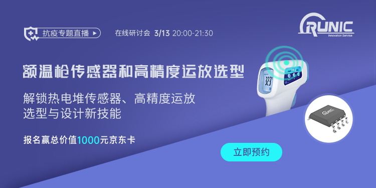 本次研讨会,润石科技全球销售总监董晨、FAE凌德辉将针对红外测温仪上用的热电堆传感器和高精度运放选型、以及设计注意事项做一探讨。